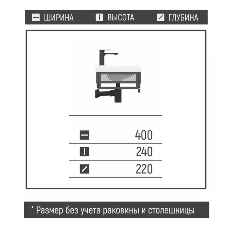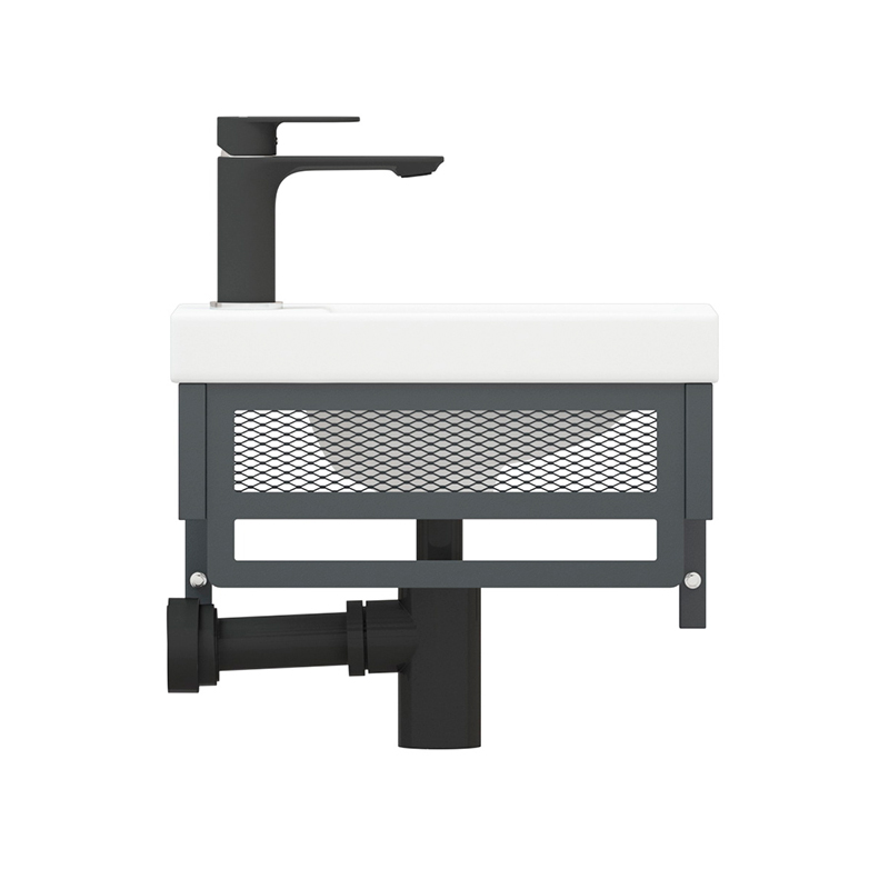 Подвесная тумба Металлика 40 торговой марки Melodia della vita с габаритными размерами 395х215х250 это современное и эргономичное решение для вашей ванной комнаты. Данная модель совместима с умывальником CERSANIT COMO 40 (58421). К данной тумбе также подойдет умывальник ТМ Santek Миранда 40 (713505). Конструкция тумбы представляет собой металлический каркас, на который устанавливается раковина. Снизу расположена полка. В боковинах предусмотрены отверстия для крепления к стене. Спереди, по бокам и в полке мет. сетка. Спереди и по бокам есть место чтобы повесить полотенце. Каркас выполнен из профильной металлической трубы 20х20 мм, листового металла 1,5 мм толщиной, металлической сетки. Весь металл окрашен в чёрную порошковую краску. Поставляется в разобранном виде в комплекте с креплением к стене. Умывальник приобретается отдельно.