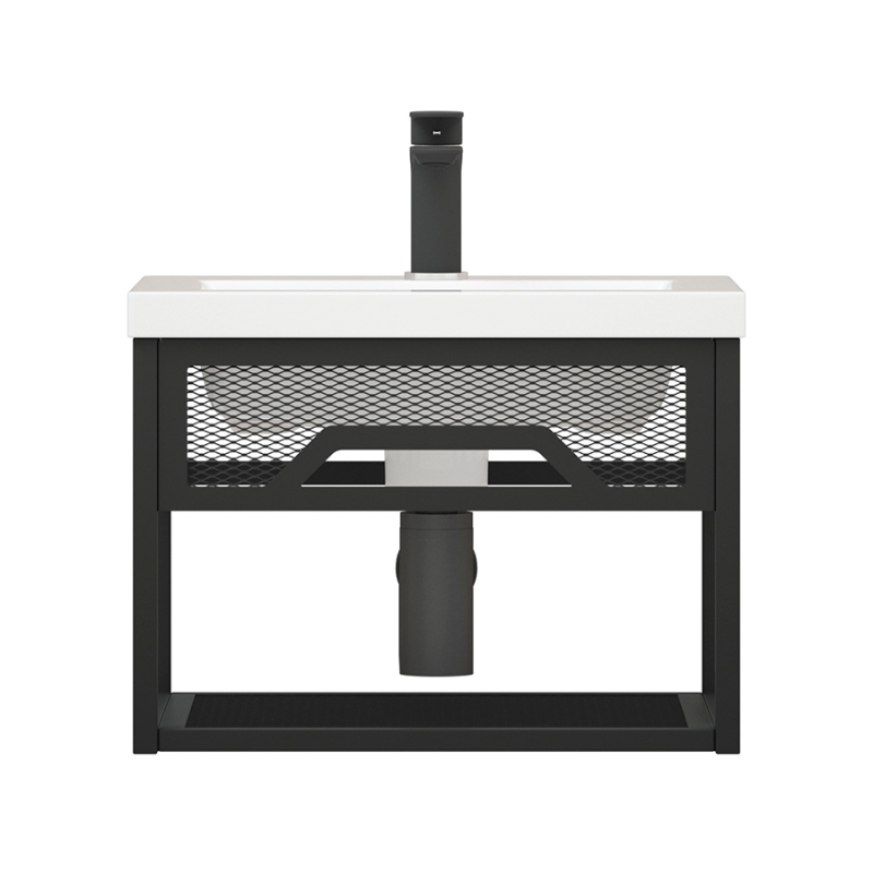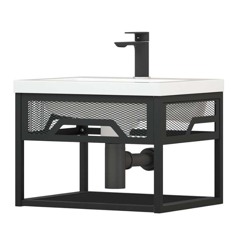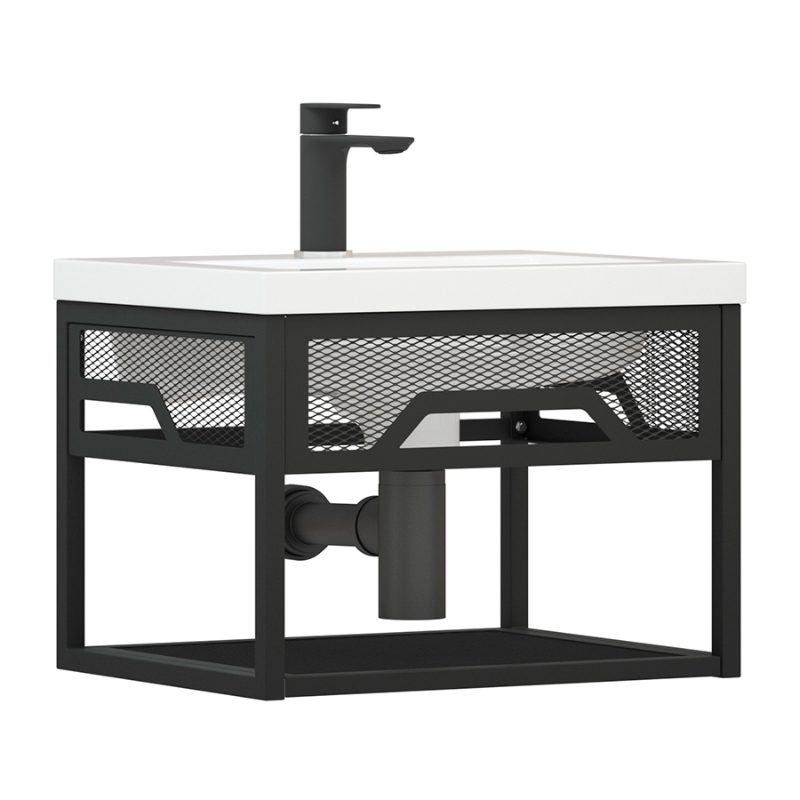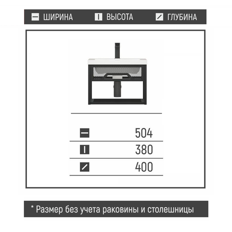 Подвесная тумба Металлика 50 торговой марки Melodia della vita с габаритными размерами 496х390х350 это современное и эргономичное решение для вашей ванной комнаты. Данная модель совместима с умывальником CERSANIT COMO 50 (104208). Конструкция тумбы представляет собой металлический каркас, на который устанавливается раковина. Снизу расположена полка. В боковинах предусмотрены отверстия для крепления к стене. Спереди, по бокам и в полке мет. сетка. Спереди и по бокам есть место чтобы повесить полотенце. Каркас выполнен из профильной металлической трубы 20х20 мм, листового металла 1,5 мм толщиной, металлической сетки. Весь металл окрашен в чёрную порошковую краску. Поставляется в разобранном виде в комплекте с креплением к стене. Умывальник приобретается отдельно.