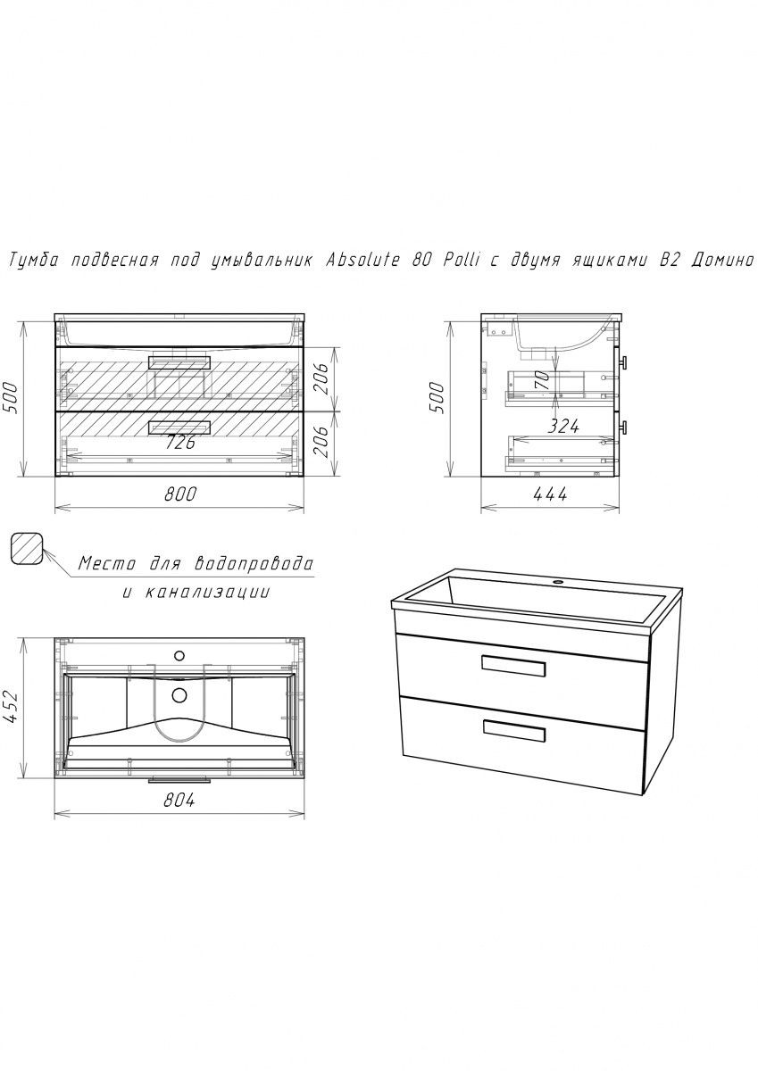 Тумба подвесная под умывальник Absolute 80 Polli с двумя ящиками В2 Домино (DP6302T)