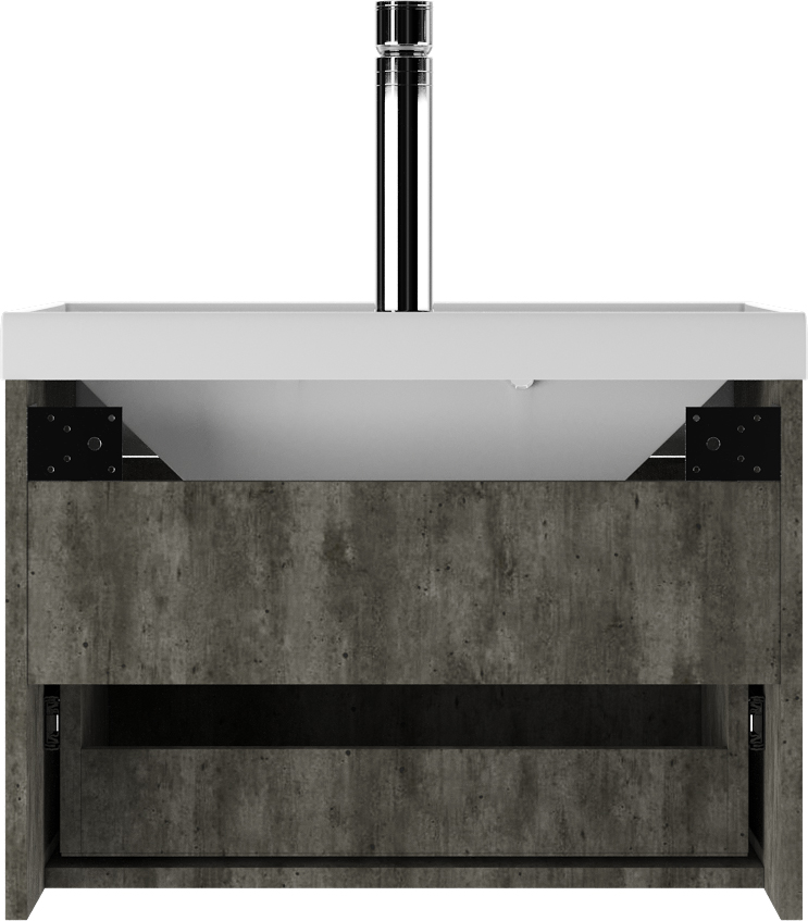 Цвет «Бетон» делает её стильной деталью интерьера. Яркое исполнение добавляет свежести пространству ванной комнаты. Внутреннее пространство тумбы удобно организовано благодаря наличию ящика. Направляющие шариковые полного выдвижения обеспечивают лёгкий доступ к содержимому.