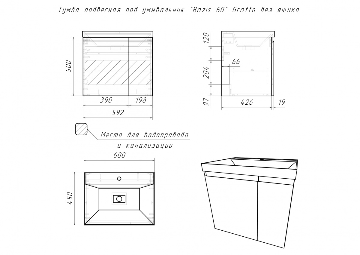 Тумба подвесная под умывальник Bazis 60 Graffo графит матовый без ящика Домино (DGr2406T)