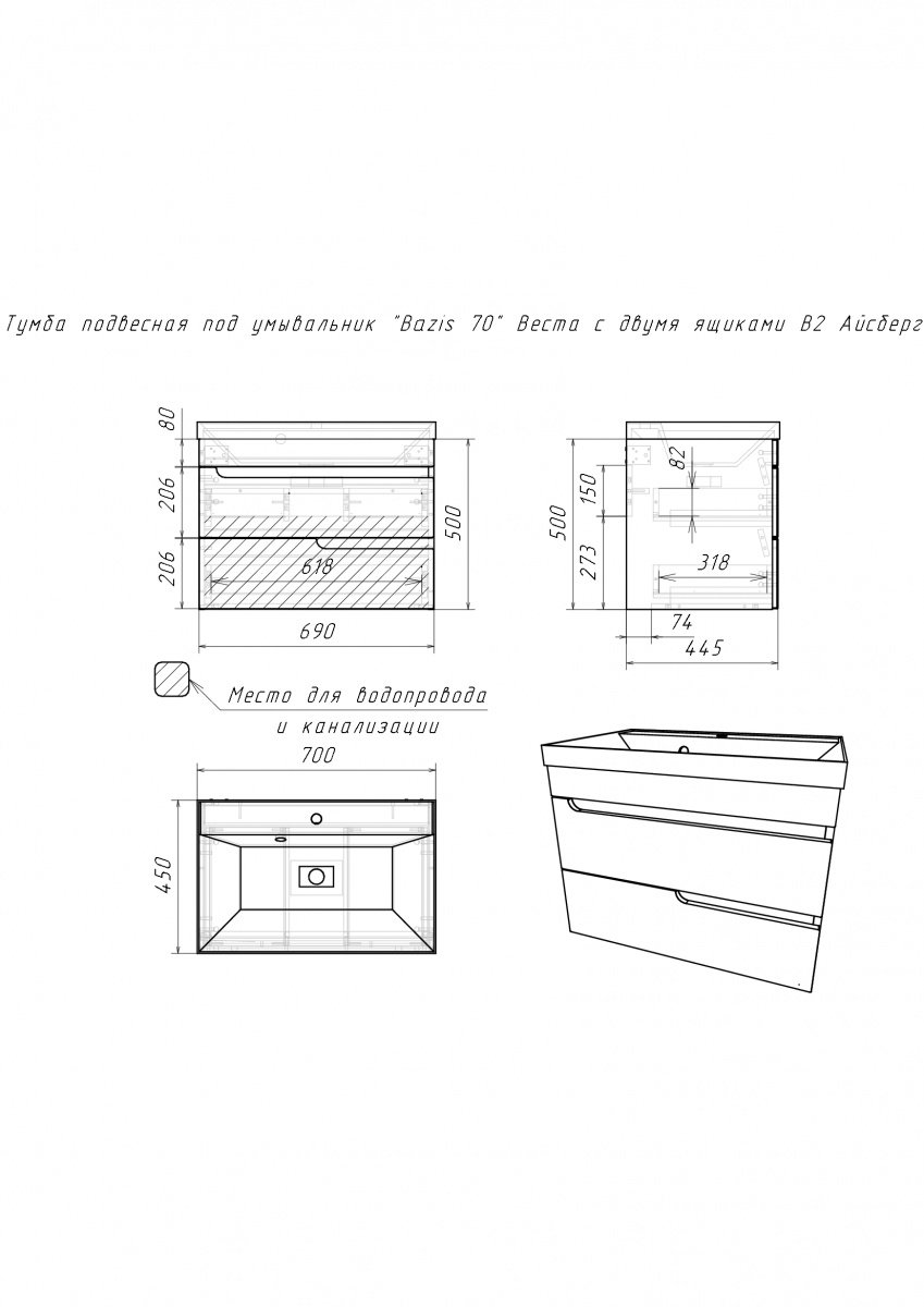 Тумба подвесная под умывальник Bazis 70 Веста с двумя ящиками В2 Айсберг Домино (DV5916T)