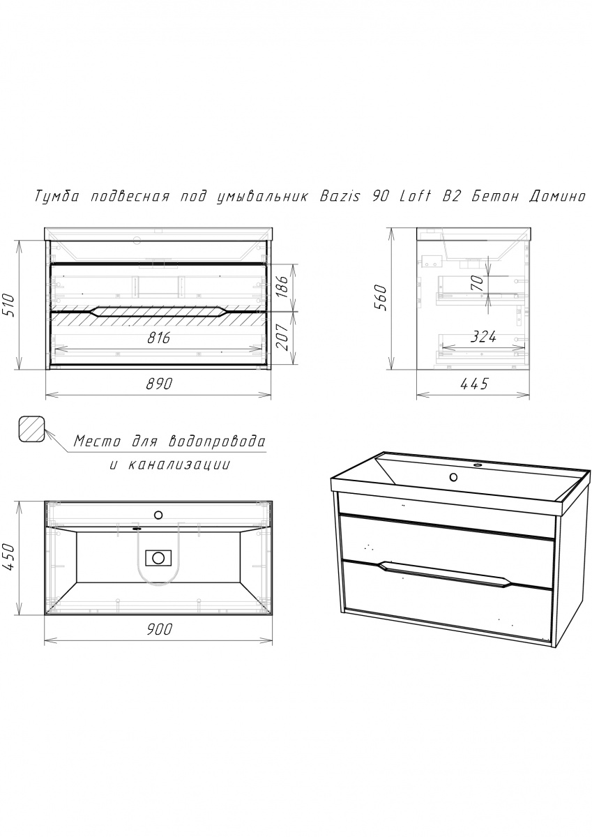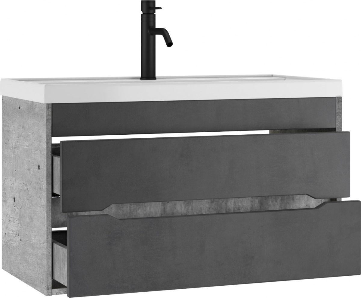 Тумба подвесная под умывальник ""Bazis 90"" Loft В2 Бетон Домино для ванной из коллекции Loft станет стильным и функциональным дополнением вашего интерьера. Изготовленная из ЛДСП и МДФ с покрытием пленкой ПВХ, она гарантирует долговечность и устойчивость к условиям высокой влажности. Цвет корпуса в оттенке Метрополитан Грей и темно-серый фасад, имитирующий бетон, подчеркнут современный стиль вашей ванной комнаты. Мебель для ванной комнаты должна быть не только эстетичной, но и практичной, что полностью относится к этому изделию. Главной особенностью этой тумбы являются два выдвижных ящика с направляющими скрытого полного выдвижения. Благодаря доводчику механизмы работают мягко и бесшумно, обеспечивая комфортное использование даже при частом доступе к содержимому. Это идеально подходит для хранения необходимых принадлежностей или полотенец там, где они всегда будут под рукой.