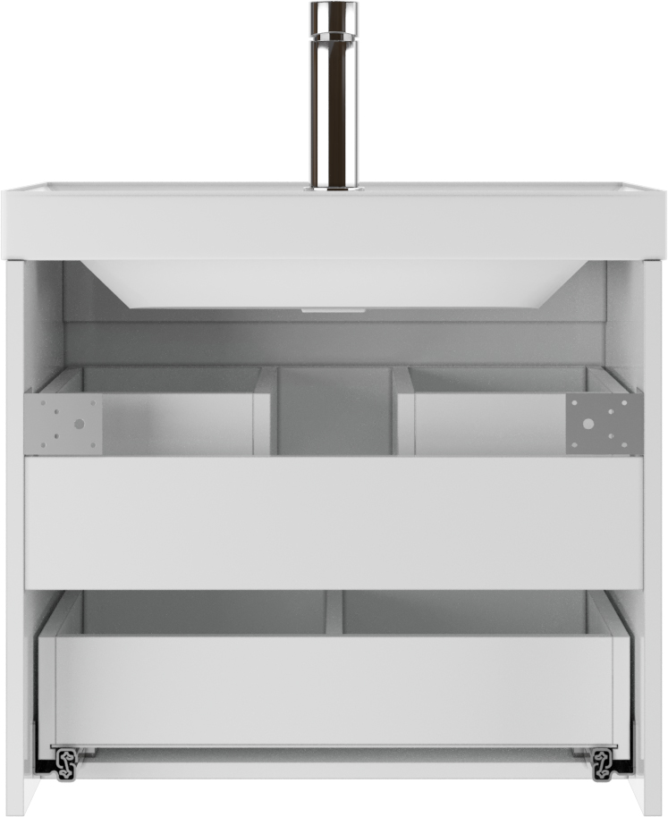 Эта тумбочка под раковину оснащена двумя выдвижными ящиками с направляющими скрытого монтажа, позволяющими открывать их полностью и бесшумно благодаря доводчикам. Использование подобных механизмов позволяет организовать пространство тумбы максимально эффективно, делая ее удобной для хранения различных предметов личной гигиены или бытовых принадлежностей.