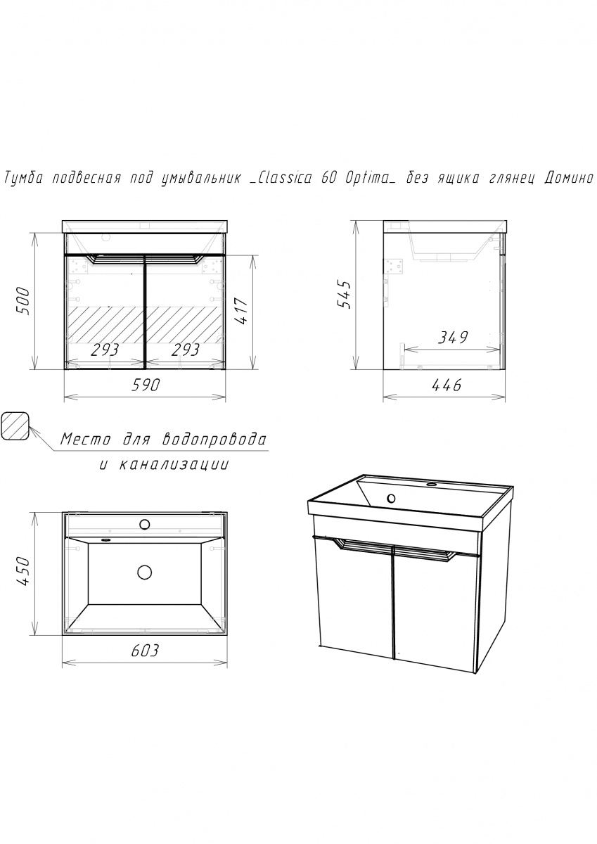 Тумба подвесная под умывальник ""Classica 60"" Optima без ящика глянец Домино станет прекрасным дополнением вашей ванной комнаты.