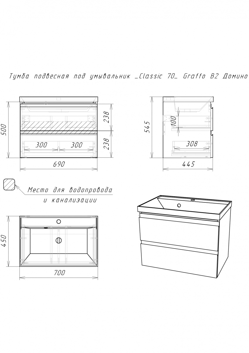Тумба подвесная под умывальник ""Classica 70"" Graffo графит матовый В2 Домино обладает стильным дизайном и функциональностью. Она идеально подойдет для ванной комнаты. Стильная тумбочка является практичным решением для хранения. Мебель в ванную гармонирует с современными интерьерами.