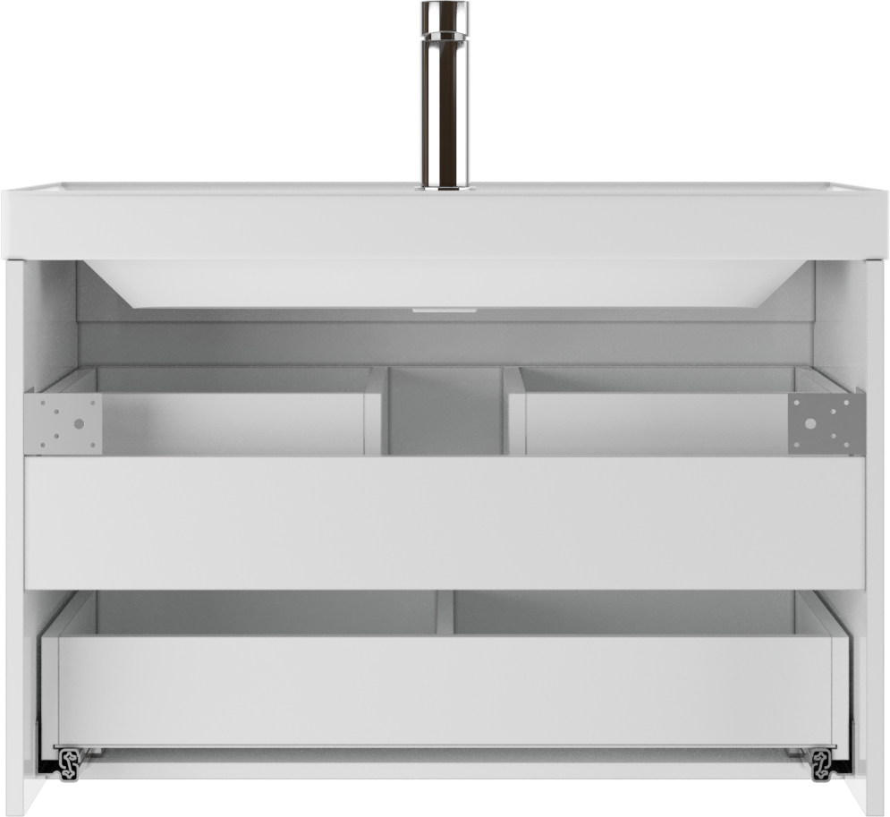 Эта тумбочка под раковину оснащена двумя выдвижными ящиками с направляющими скрытого монтажа, позволяющими открывать их полностью и бесшумно благодаря доводчикам. Использование подобных механизмов позволяет организовать пространство тумбы максимально эффективно, делая ее удобной для хранения различных предметов личной гигиены или бытовых принадлежностей.