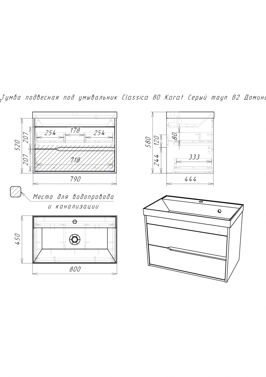 Тумба подвесная под умывальник Classica 80 Karat Серый тауп В2 Домино (DK3216T)
