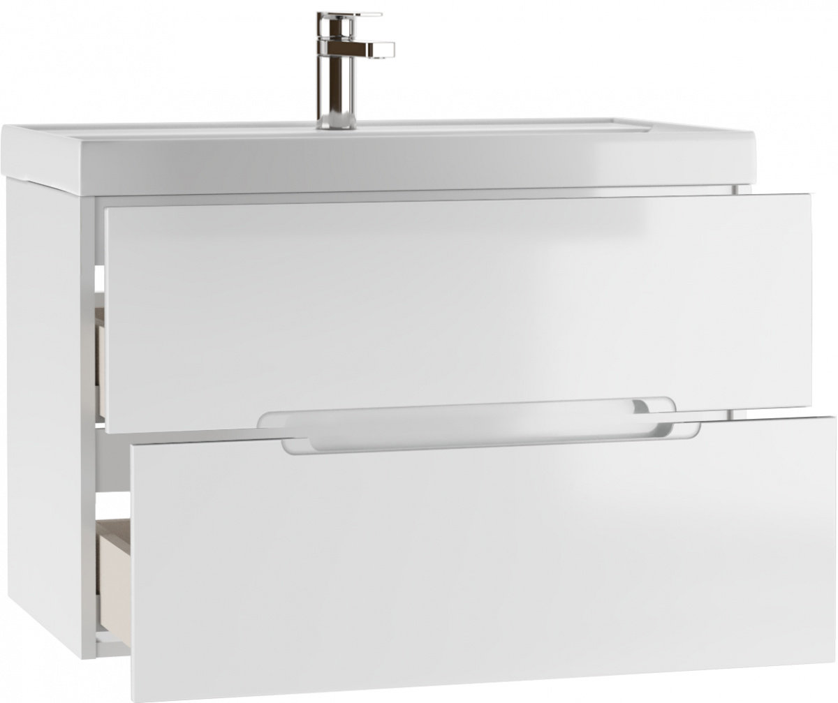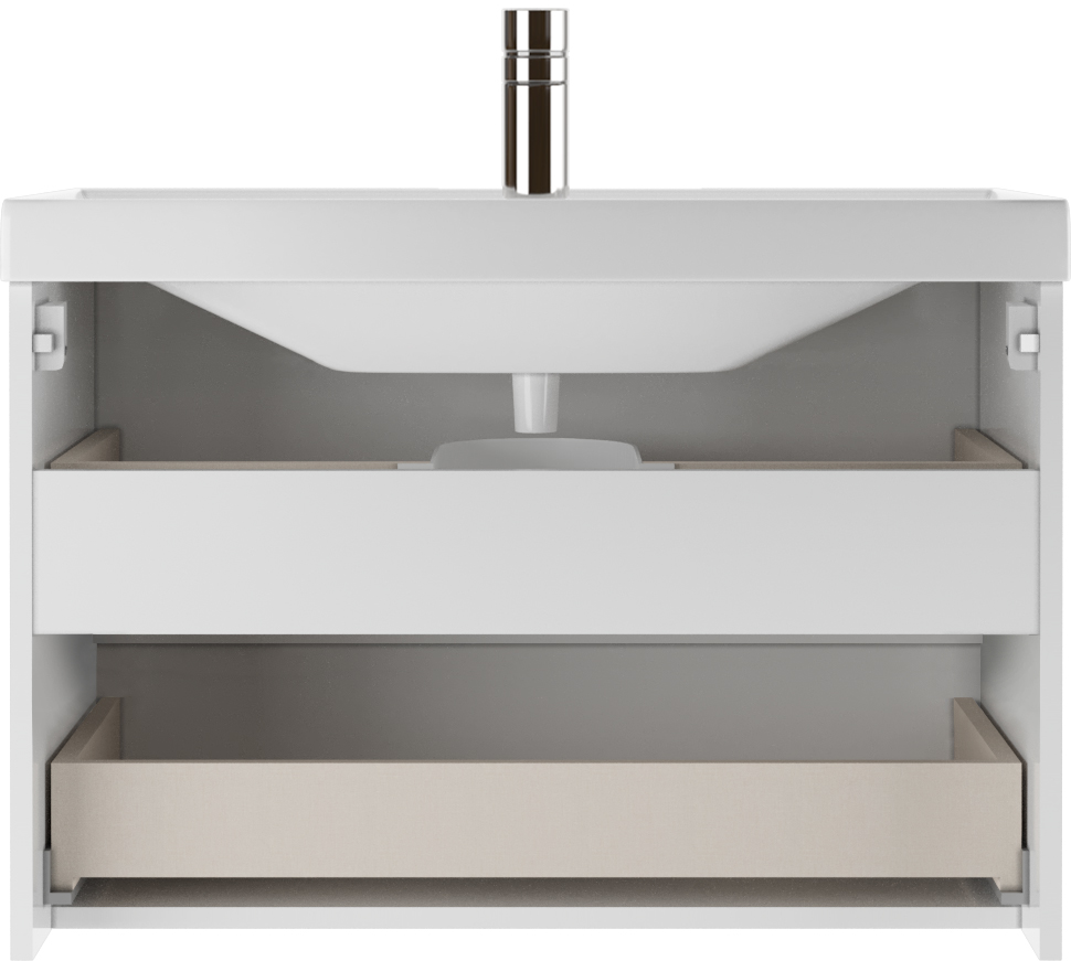 Мебель для ванной включает два функциональных выдвижных ящика. Это позволяет хранить все необходимые вещи в порядке и легко к ним добираться. Тумба подвесная оснащена направляющими скрытого полного выдвижения с доводчиком, что делает использование удобным и надежным на протяжении всего срока службы.