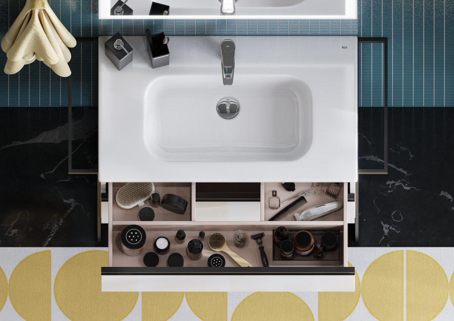 Модуль под раковину DOMI с черной матовой металлической удобной ручкой во всю ширину профиля и направляющими с функцией soft-close. Нижняя часть ручки обработана под углом, что предотвращает скопление воды и пыли. Ручка защищает фасады модуля от попадания капель воды с раковины, а также защищает углы модуля от ударов и износа. Внутренняя отделка ящиков выполнена в цвете бежевый текстиль, приятна на ощупь и предотвращает скольжение предметов. Пространство верхнего ящика разделено на три части, что позволяет хранить предметы для ванной комнаты в идеальном порядке. По желанию клиента модуль DOMI может комплектоваться черными матовыми опорами, которые представлены в двух вариантах: с полотенцедержателем и без. С помощью опор и аксессуаров в черном цвете (Rubik, Tempo, Ice) можно расставить четкие акценты в интерьере и создать ванную комнату в стиле лофт. Новый артикул, аналог 857536806