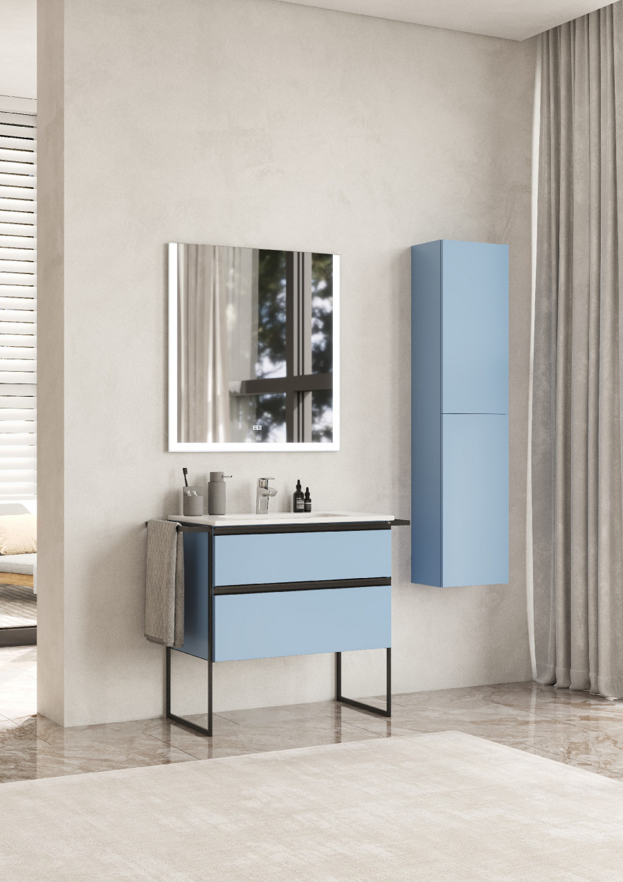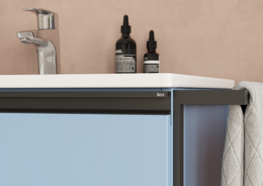 Модуль под раковину Domi с черной матовой металлической ручкой во всю ширину фасада и направляющими с функцией soft-close. Нижняя часть ручки обработана под углом, что предотвращает скопление воды и пыли. Ручка защищает фасады модуля от попадания капель воды с раковины, а также защищает углы модуля от ударов и износа. Модуль выполнен из влагостойкой ЛДСП в трендовом цвете. Внутренняя отделка ящиков выполнена в цвете бежевый текстиль, приятна на ощупь и предотвращает скольжение предметов. Пространство верхнего ящика разделено на три части, что позволяет хранить предметы для ванной комнаты в идеальном порядке. По желанию модуль Domi можно комплектовать черными матовыми опорами, которые представлены в двух вариантах: с полотенцедержателем и без.
