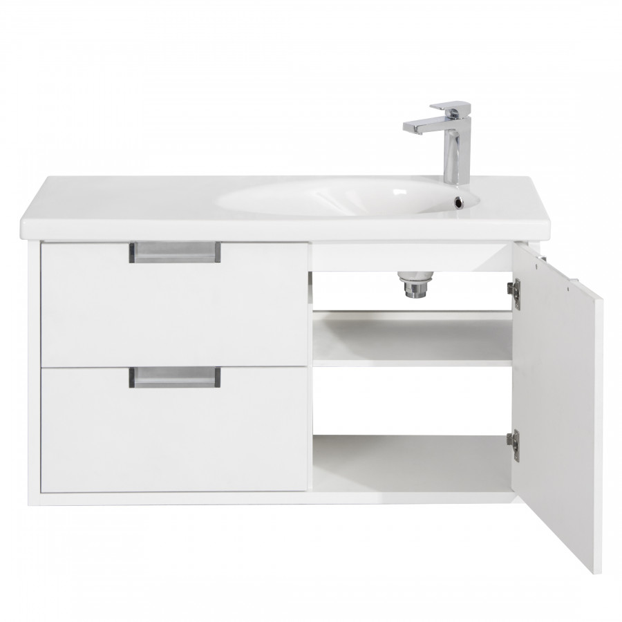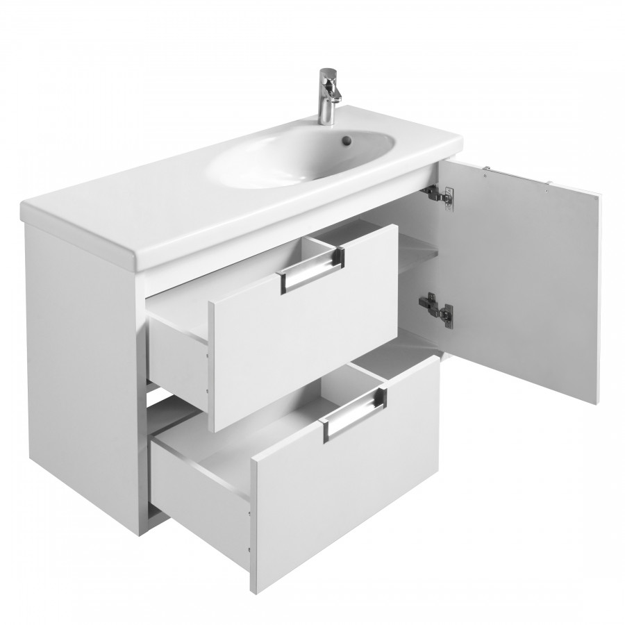 Тумба для раковины Etna в современном стиле от испанского бренда Roca, выполненная из влагостойкой высококачественной ЛДСП и МДФ с ящиками и распашной дверцей с доводчиками.