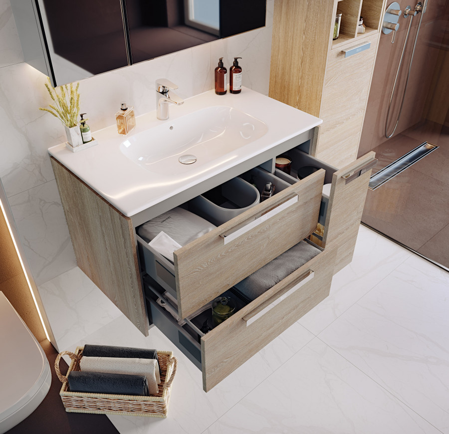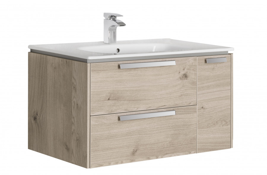 Тумба для раковины Lago в современном стиле от испанского бренда Roca, выполненная из высококачественной влагостойкой ЛДСП в цвете светлый дуб, с ящиками полного выдвижения и бутылочницей.
