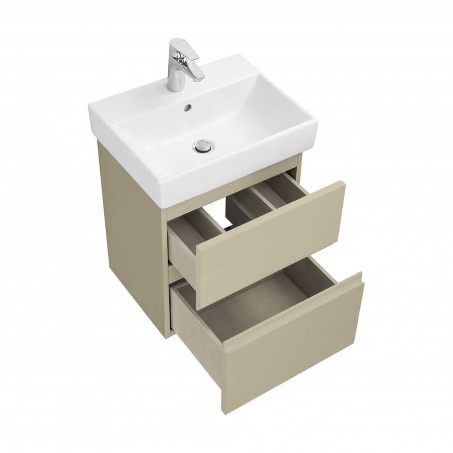 Модуль с компактной глубиной позволяет использовать мебель OLETA даже в небольших ванных комнатах. К тумбе подходит раковина OLETA с достаточно вместительной чашей. Лаконичный и современный дизайн раковины притягивает к себе взгляд. Два выдвижных ящика тумбы установлены на надежные направляющие, которые гарантируют продолжительную безупречную функциональность и максимальный комфорт эксплуатации. Скрытый монтаж не портит элегантный дизайн мебели, а возможность полного выдвижения обеспечит быстрый доступ к необходимым предметам. Внутренняя отделка ящиков выполнена в цвете бежевый текстиль, приятна на ощупь и предотвращает скольжение предметов. Профильная ручка во всю ширину фасада удобна в использовании и позволяет сочетать мебель OLETA c различными цветами смесителей и аксессуаров для ванной комнаты. Ручка выполнена в виде J-профиля.