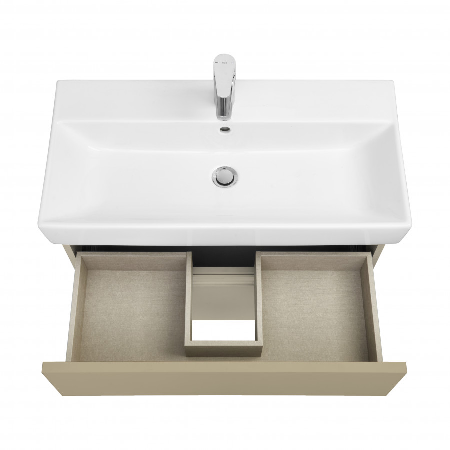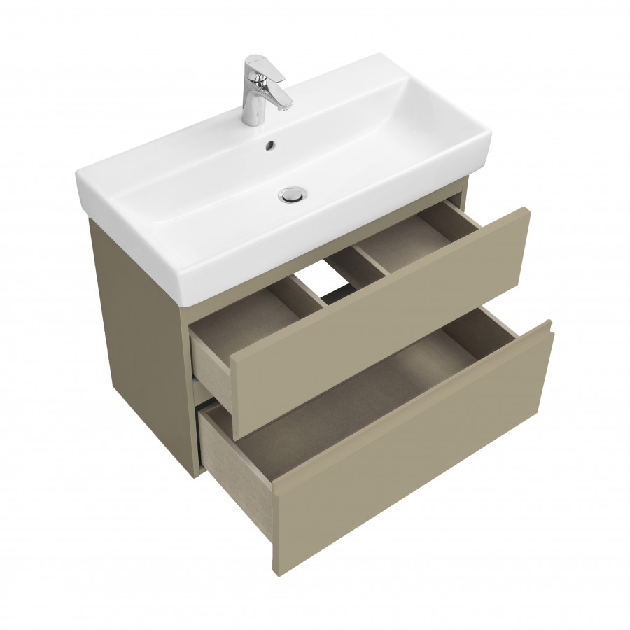Модуль с компактной глубиной позволяет использовать мебель OLETA даже в небольших ванных комнатах. К тумбе подходит раковина OLETA с достаточно вместительной чашей. Лаконичный и современный дизайн раковины притягивает к себе взгляд. Два выдвижных ящика тумбы установлены на надежные направляющие, которые гарантируют продолжительную безупречную функциональность и максимальный комфорт эксплуатации. Скрытый монтаж не портит элегантный дизайн мебели, а возможность полного выдвижения обеспечит быстрый доступ к необходимым предметам. Внутренняя отделка ящиков выполнена в цвете бежевый текстиль, приятна на ощупь и предотвращает скольжение предметов. Профильная ручка во всю ширину фасада удобна в использовании и позволяет сочетать мебель OLETA c различными цветами смесителей и аксессуаров для ванной комнаты. Ручка выполнена в виде J-профиля.
