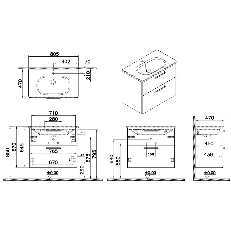 Тумба подвесная Vitra Root 80 см с квадратной раковиной 2 ящика матовый серый камень (68289)