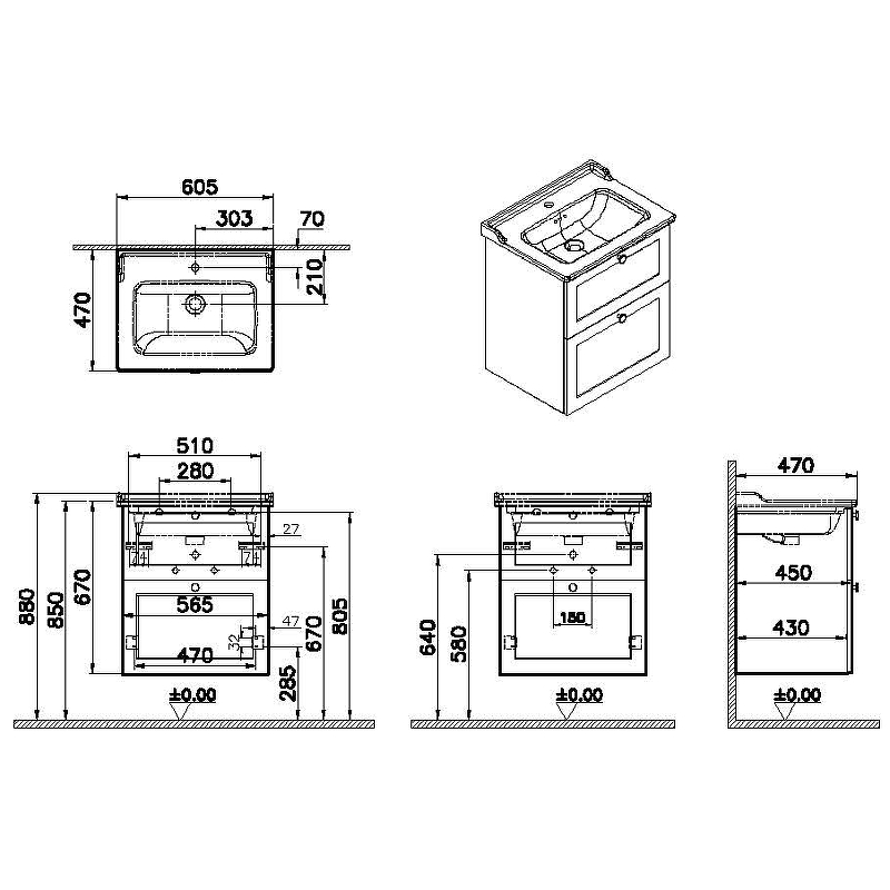 ТУмба подвесная Vitra Root Classic 60 см с классической раковиной, 2 ящика, матовый белый (68848)