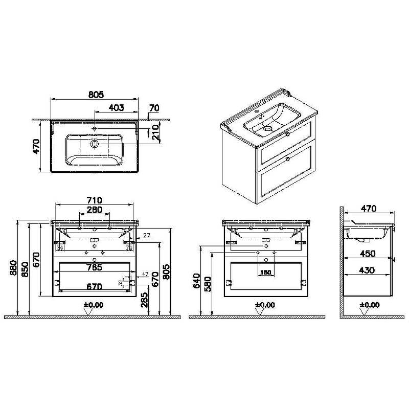 ТУмба подвесная Vitra Root Classic 80 см с классической раковиной, 2 ящика, матовый белый (68869)