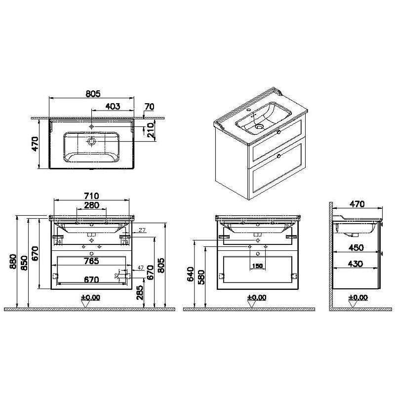 ТУмба подвесная Vitra Root Classic 80 см с классической раковиной, 2 ящика, матовый темно-синий (68874)
