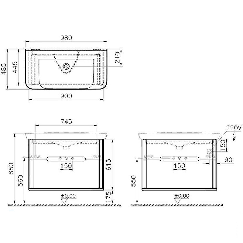 ТУмба подвесная Vitra Sento 100 см с раковиной, с 2 ящиками, с LED подсветкой, матовый белый (60826)