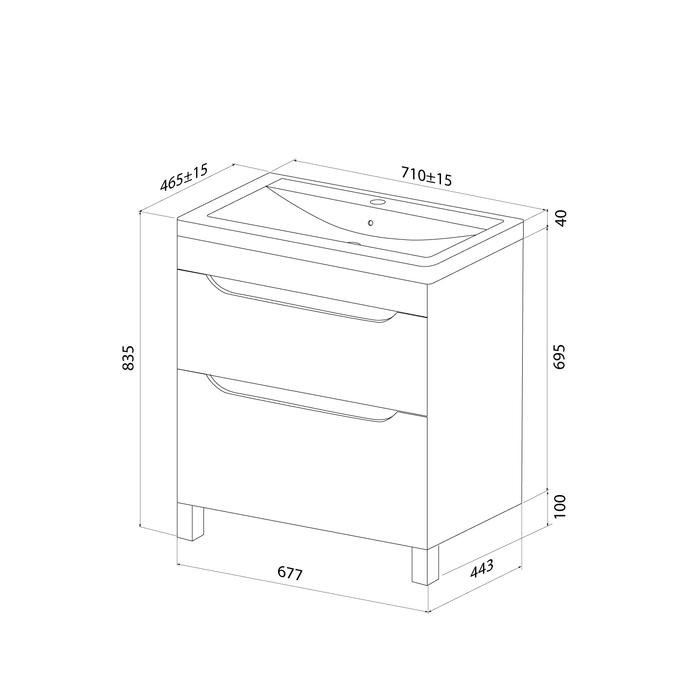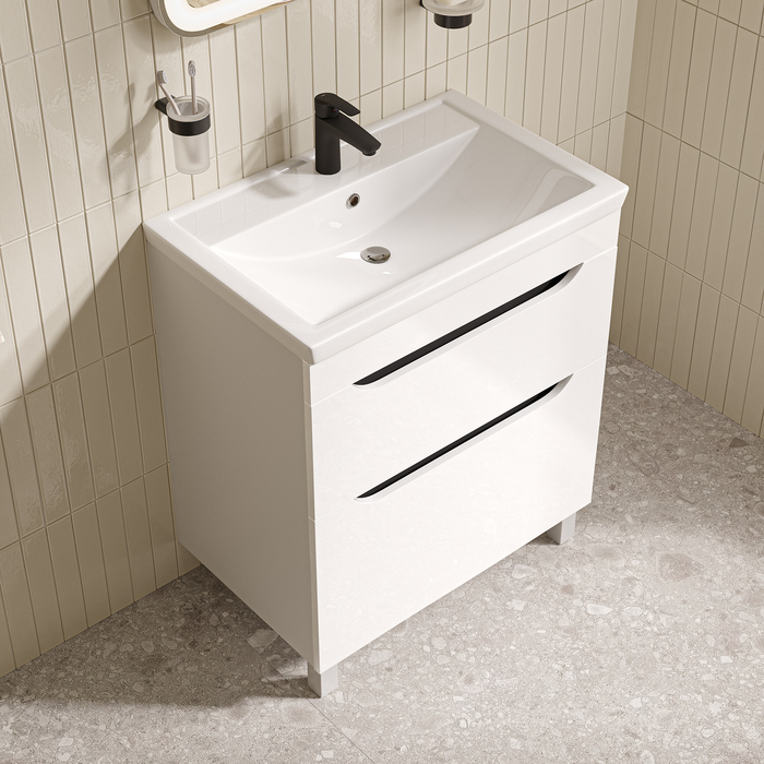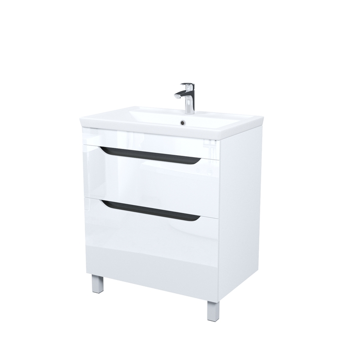 Тумба для ванной комнаты с умывальником, напольная, белая, Ray. Материал фасадов: МДФ, покрытие фасадов: глянцевая эмаль. Материал боковин: ЛДСП, покрытие боковин: ламинация. Производители фурнитуры: IDDIS, Hettich. Подходит умывальник: 4077000i28. Ножки 100 мм, матовый хром.