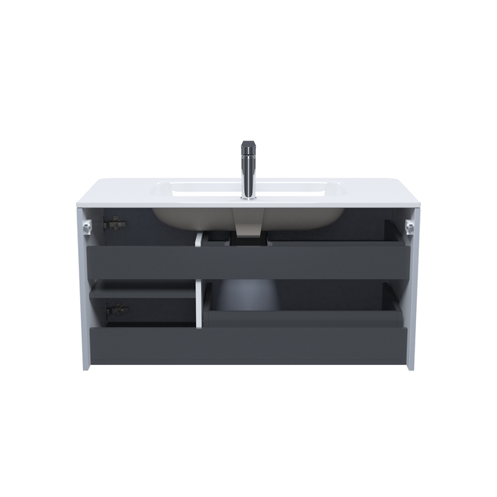 Два выдвижных ящика с механизмом плавного доведения, одна распашная дверца. Пластиковый, серый ограничитель под сифон в верхнем ящике. Серые внутря: ящики, боковины. Навесы усиленные с планкой.