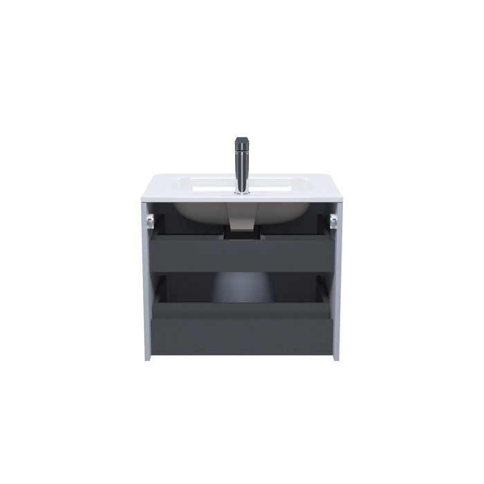 Два выдвижных ящика с механизмом плавного доведения. Пластиковый, серый ограничитель под сифон в верхнем ящике. Серые внутря: ящики, боковины. Навесы усиленные с планкой.