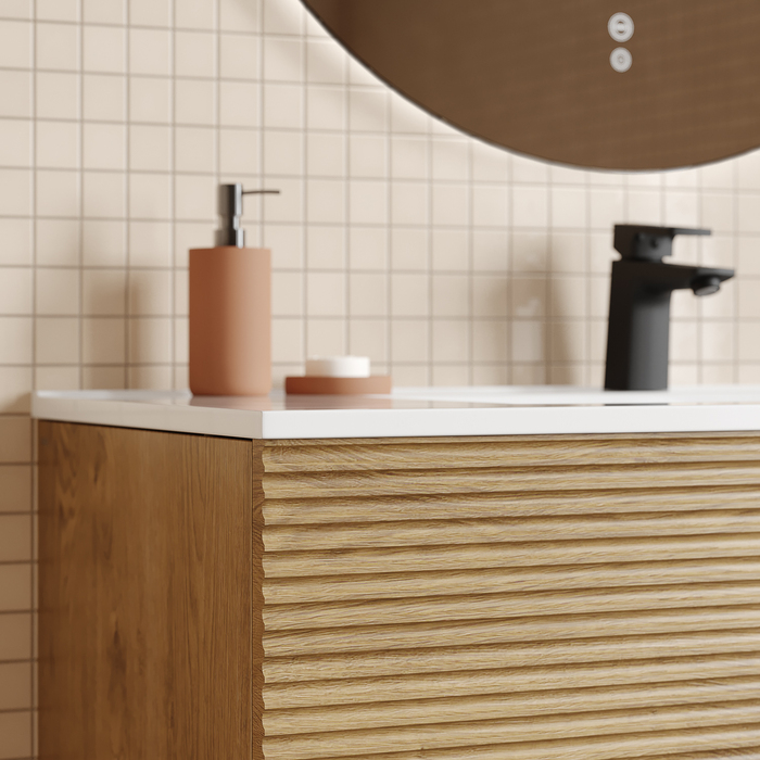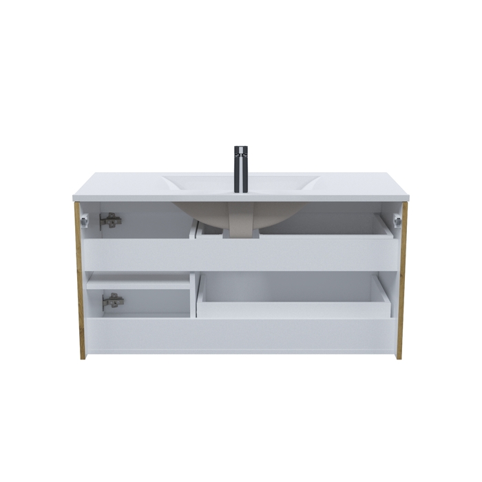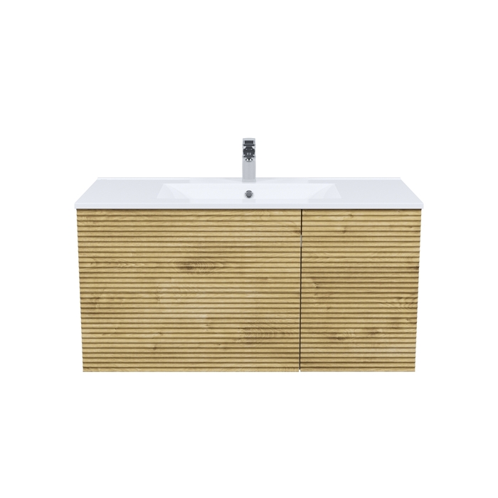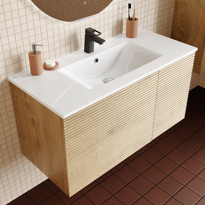 Тумба для ванной комнаты с умывальником, подвесная, Bild. Размер комплекта: 452*1003*500 (Д*Ш*В). Система установки: навесная. Материал фасада: МДФ. Материал боковин: ЛДСП. Покрытие фасада: пленка ПВХ. Цвет: дуб светлый. Фурнитура: Hettich, IDDIS. Система открывания: Push-to-Open. Пластиковая защита сифона в верхнем ящике. Фрезеровка «полосы» горизонтальная. Умывальник: 0131000i28. Материал умывальника: санфарфор.