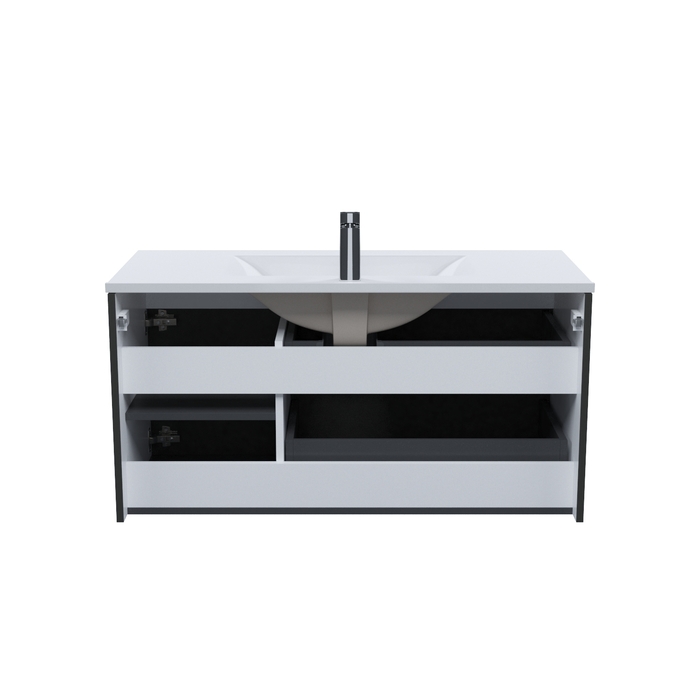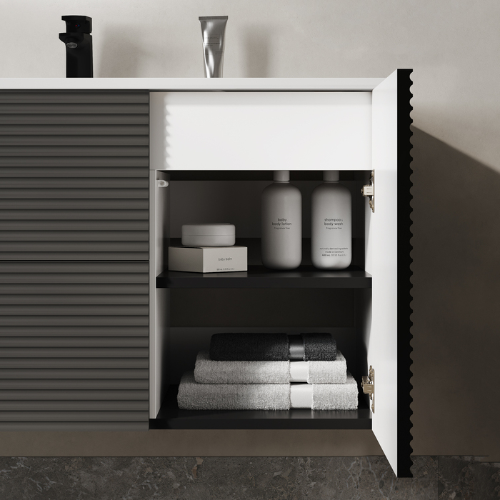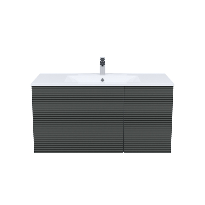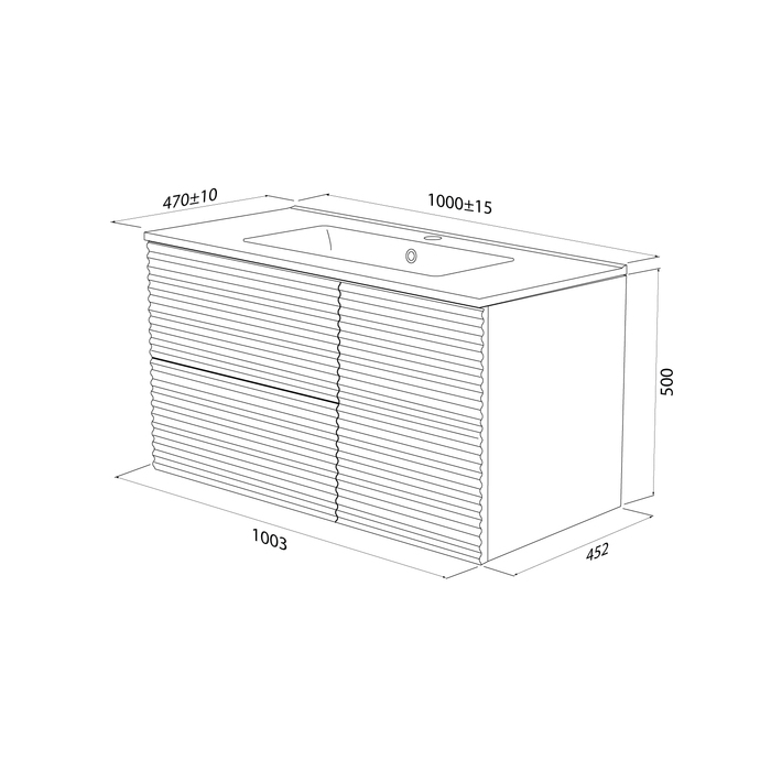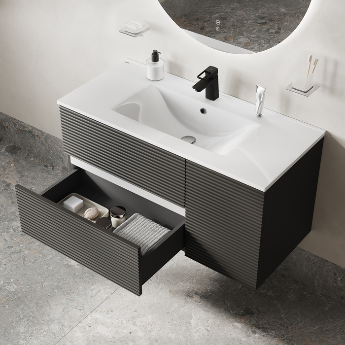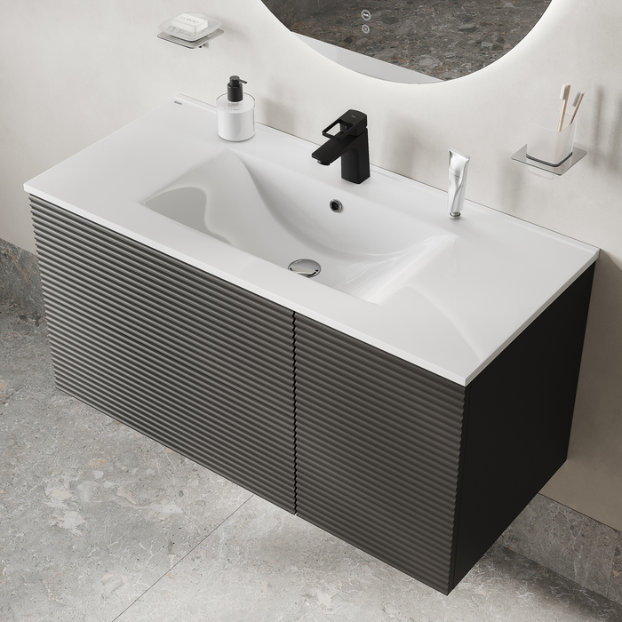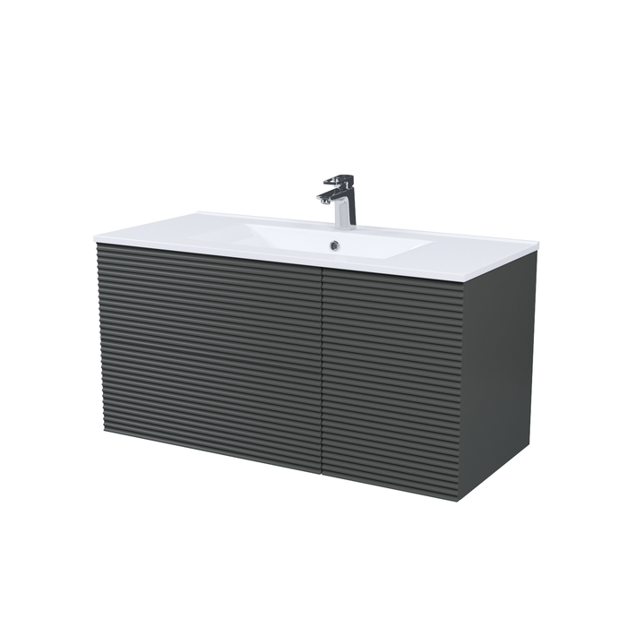 Тумба для ванной комнаты с умывальником, подвесная, Bild. Размер комплекта: 452*1003*500 (Д*Ш*В). Система установки: навесная. Материал фасада: МДФ. Материал боковин: МДФ. Покрытие фасада и боковин: пленка ПВХ. Цвет: темно-серый. Фурнитура: Hettich, IDDIS. Система открывания: Push-to-Open. Пластиковая защита сифона в верхнем ящике. Фрезеровка «полосы» горизонтальная. Умывальник: 0131000i28. Материал умывальника: санфарфор.