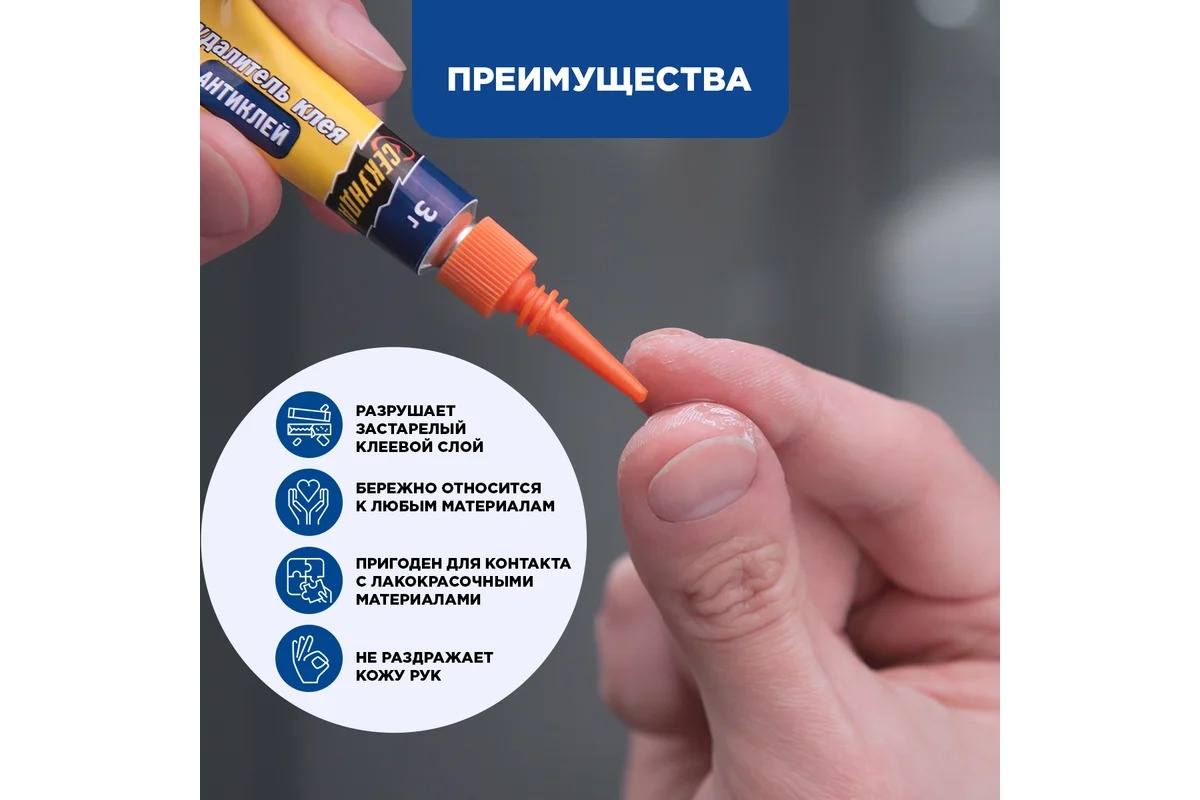 Специальная формула позволяет разрушать даже застарелый клеевой слой практически любых видов клея, в том числе на основе цианоакрилата. Удалитель клея бережно относится к любым материалам, пригоден для контакта с лакокрасочными материалами, не раздражает кожу рук.