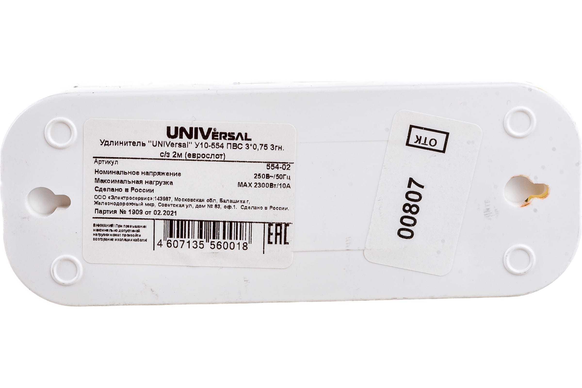 Удлинитель У10-554 ПВС 3x0,75 3гн. 2м UNIVersal 554-02 представляет собой сочетание шнура питания марки ПВС, угловой вилки и пластиковой колодки с тремя гнездами, имеющими заземляющие контакты. Изделие позволяет подключать электрические устройства вдали от стационарной розетки 220 В. Удлинитель предназначается для использовнаия в закрытых помещениях бытового назначения.