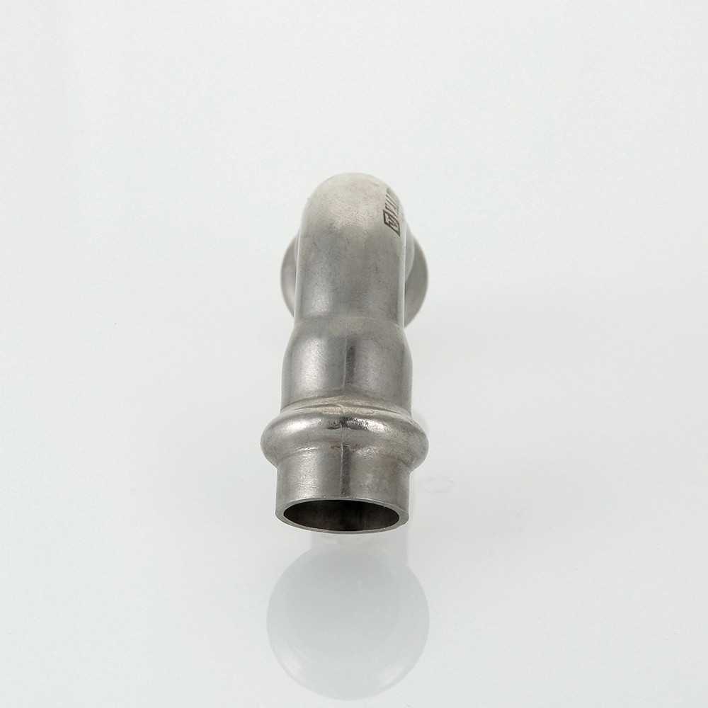 Двухраструбный пресс-угольник из нержавеющей стали обеспечивает соединение под углом 90° тонкостенных стальных труб систем водоснабжения, отопления, иных инженерных и технологических установок с рабочей температурой до 120 °С и давлением до 16 бар. Изделие изготовлено из стали AISI 304. Материал уплотнительных колец – эластомер EPDM. Отдельно можно приобрести уплотнительные кольца из FPM (витон), в этом случае максимальная рабочая температура увеличивается до 140 °С.