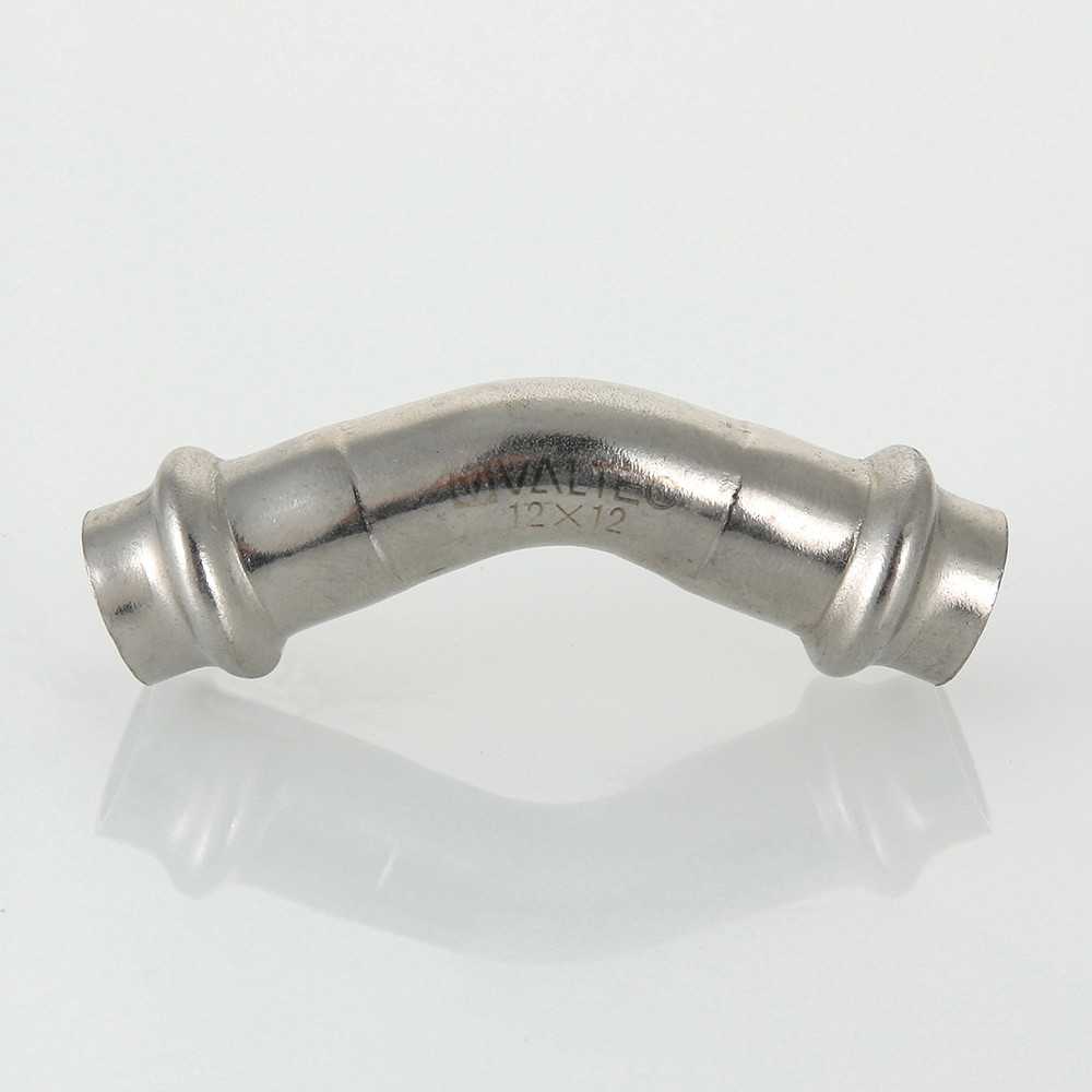 Двухраструбный пресс-угольник 45° из нержавеющей стали обеспечивает соединение тонкостенных стальных труб систем водоснабжения, отопления, иных инженерных и технологических установок с рабочей температурой до 120 °С и давлением до 16 бар. Изделие изготовлено из стали AISI 304. Материал уплотнительных колец – эластомер EPDM. Отдельно можно приобрести уплотнительные кольца из FPM (витон), в этом случае максимальная рабочая температура увеличивается до 140 °С.