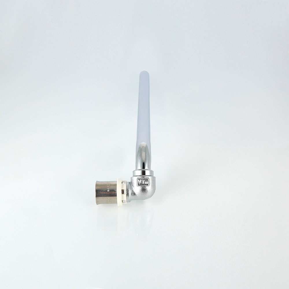 Угловой пресс-фитинг с хромированной латунной трубкой (наружный диаметр – 15, толщина стенки – 1 мм) для подключения отопительного прибора к разводке из металлополимерных труб.