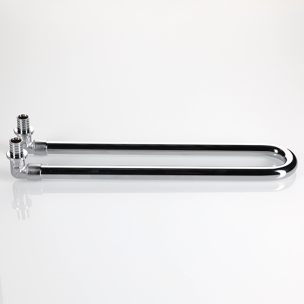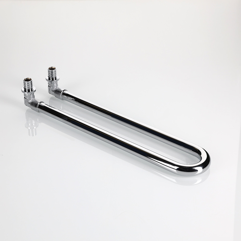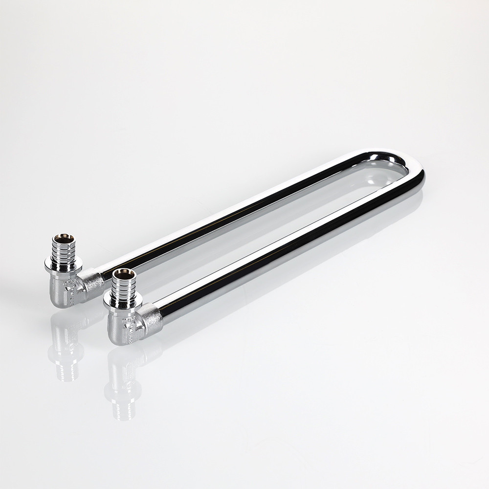 Сдвоенный аксиальный угловой фитинг с латунной хромированной трубкой VTm.481.DС может применяться в случае, когда гидравлическое испытание (опрессовка) отопительной разводки производится до монтажа отопительных приборов. При этом соединитель используется как временный замыкающий участок. После проведения гидравлических испытаний калач трубки обрезается на требуемую длину роликовым труборезом. Длина трубки фитинга до сгиба – 30 см.
