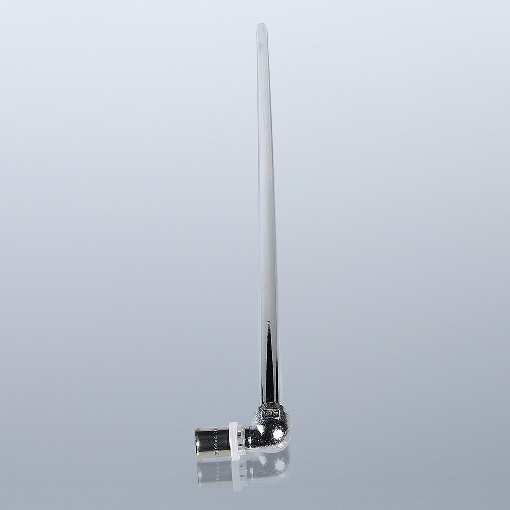Угловой пресс-фитинг с хромированной латунной трубкой (наружный диаметр – 15, толщина стенки – 1 мм) для подключения отопительного прибора к разводке из металлополимерных труб.