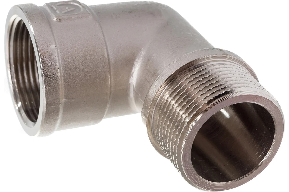 Угловой латунный никелированный фитинг. Резьба – внутренняя/наружная, цилиндрическая трубная по ГОСТу 6357 (ISO 228, EN 10226). Внутренняя резьба фитинга совместима также с наружной конической резьбой по ГОСТу 6211 (ISO R7).