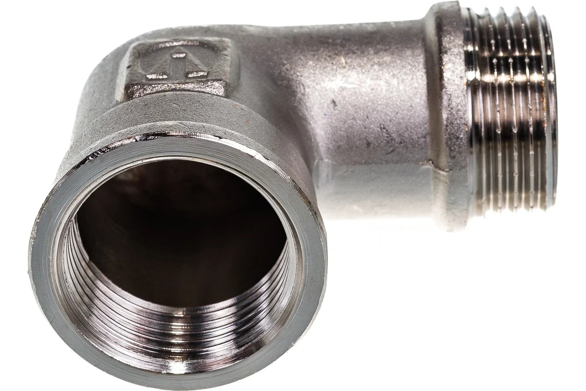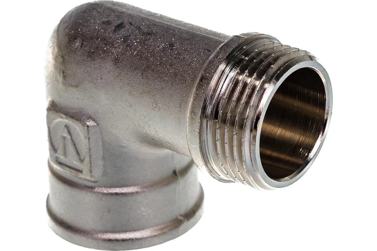 Угловой латунный никелированный фитинг. Резьба – внутренняя/наружная, цилиндрическая трубная по ГОСТу 6357 (ISO 228, EN 10226). Внутренняя резьба фитинга совместима также с наружной конической резьбой по ГОСТу 6211 (ISO R7).