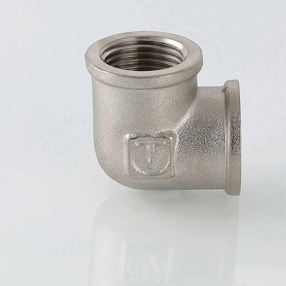 Угловой латунный никелированный фитинг. Резьба – внутренняя/внутренняя, цилиндрическая трубная по ГОСТу 6357 (ISO 228, EN 10226), совместимая также с наружной конической резьбой по ГОСТу 6211 (ISO R7).