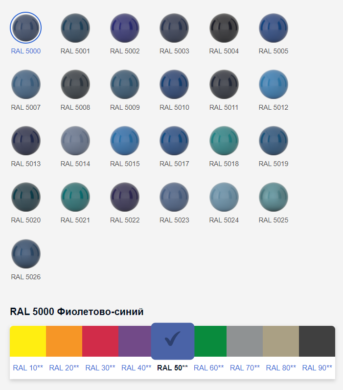 Палитра RAL Classic - порошковый метод окраски изделий в любой цвет из коллекции RAL Classic, насчитывающей 213 оттенков, в том числе 2 металлика, 15 перламутровых и 6 флуоресцентных.