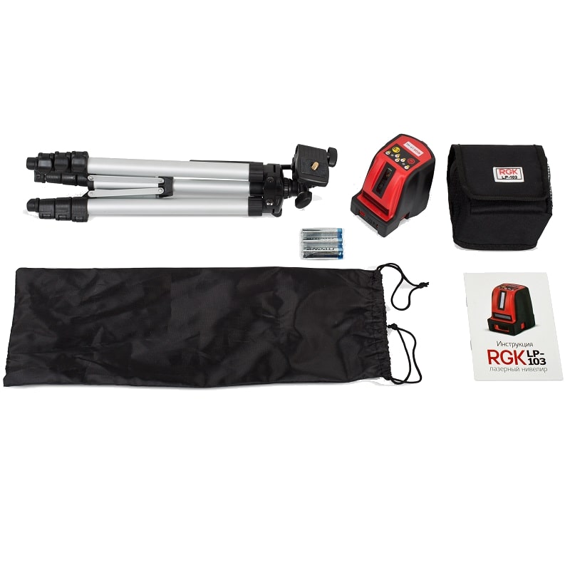 Стандартный комплект: Лазерный нивелир LP-103, штатив, футляр, элементы питания, инструкция на русском языке.