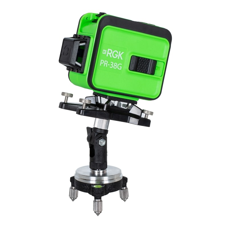 Для ровного выставления RGK PR-38G на горизонтальных поверхностях встроенная подставка снабжена 4 регулировочными винтами, которые применяются в паре с пузырьковым уровнем в верхней части устройства. Их можно выкрутить вовсе и отложить в сторону, если это требуется.