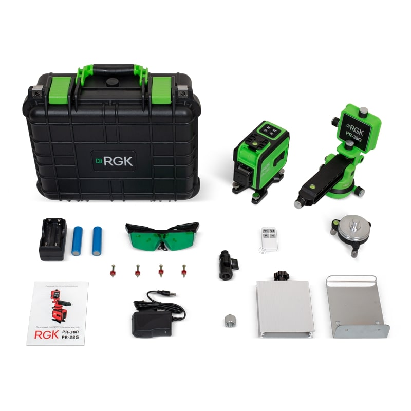 Лазерный нивелир RGK PR-38G - это уровень с 3 замкнутыми плоскостями для выполнения строительных, отделочных и дизайнерских работ в помещениях и за их пределами. Прибор проецирует 1 горизонтальный луч на высоте 2.3 см от пола и 2 взаимно перпендикулярных вертикальных. Зеленые лучи обладают лучшей видимостью в сравнении с красными, особенно в условиях хорошей освещенности. При точности ±0,2 мм/м рабочая дальность составляет 20 м, она может быть увеличена до 50 м при использовании приемника.