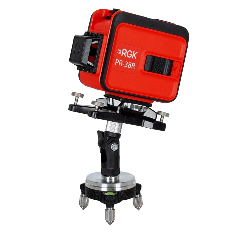 В комплекте с лазерным построителем плоскостей RGK PR-38R также идет магнитная площадка со стрелой, снабженная собственным крепежом. Ее преимущество состоит в универсальности: площадка прочно крепится к любой металлической плоскости, а на поверхности из других материалов достаточно установить комплектную переходную пластину. Кроме того, площадку можно регулировать с помощью винтов во всех направлениях и с миллиметровой точностью, что облегчает установку нивелира в требуемое положение.