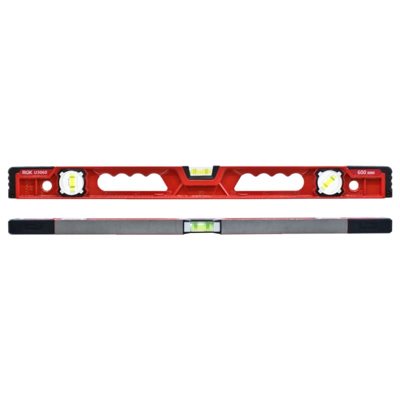 Строительный уровень RGK U3060 длиной 60 сантиметров выполнен в прочном металлическом корпусе из литого профиля, за счет чего уровень защищен от коррозии и ударов.