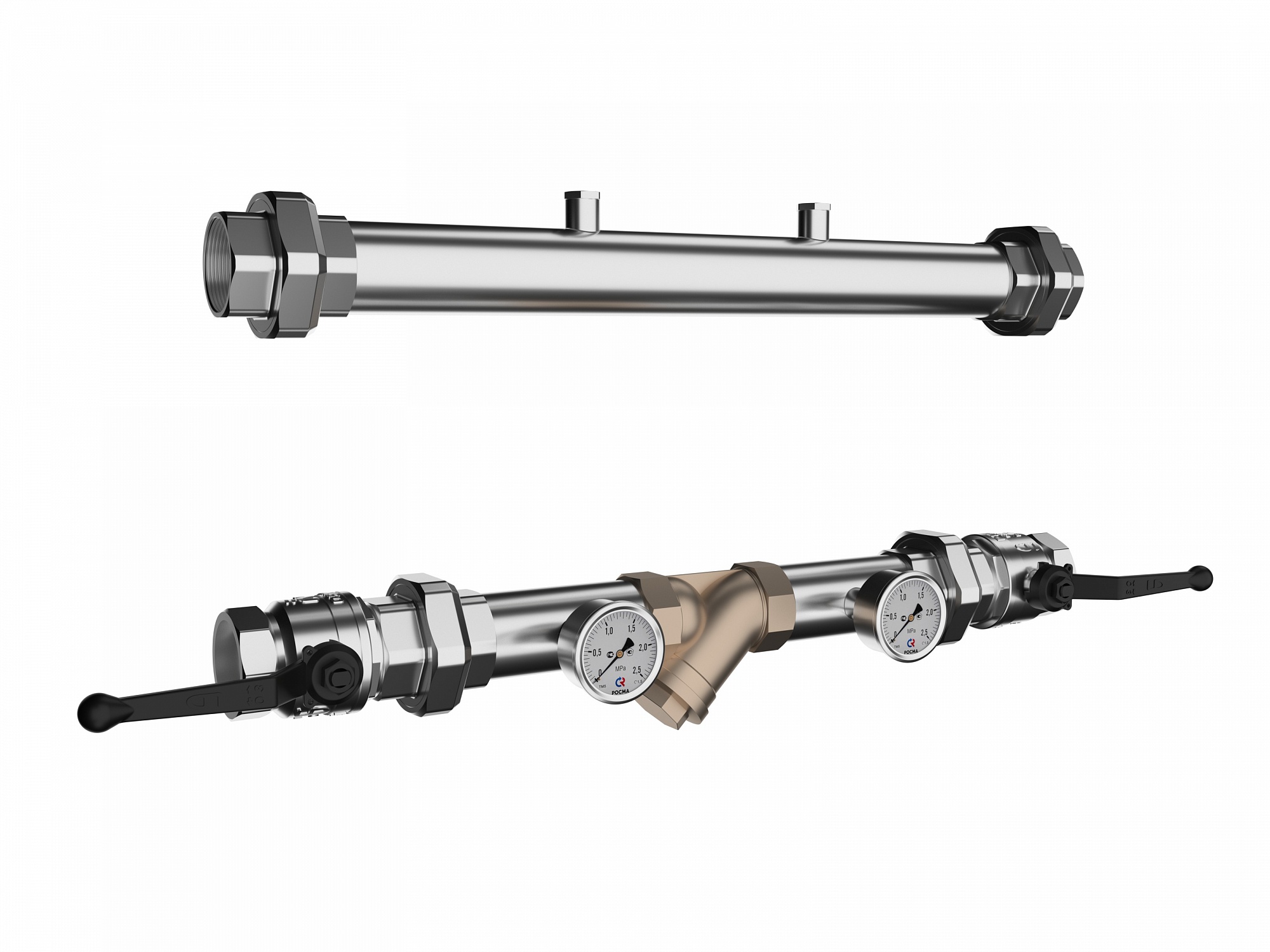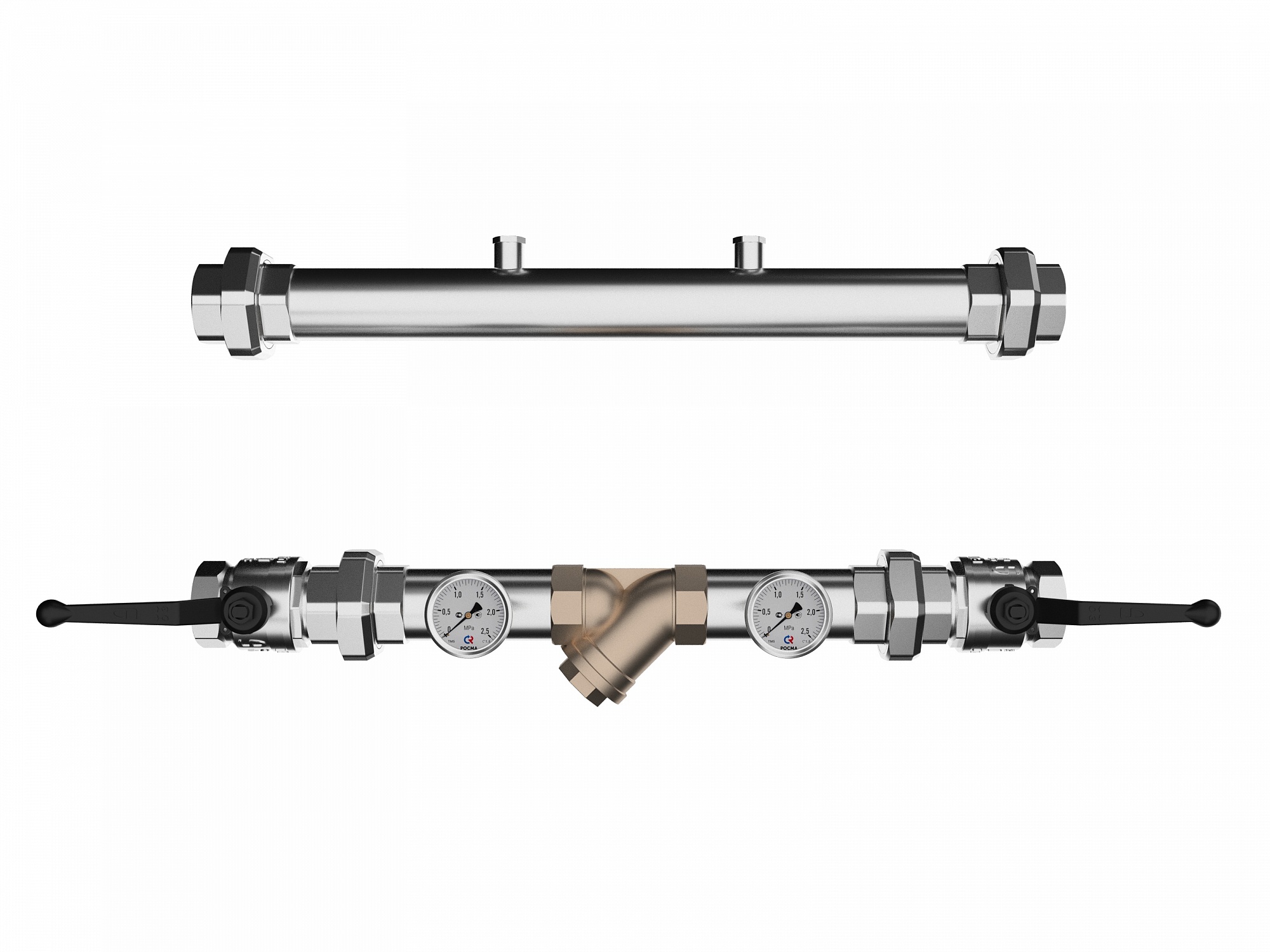 Контрольно очистительный узел предназначен для очистки теплоносителя от крупных частиц шлама тем самым продлевает срок службы дорогостоящих элементов системы отопления (котлов, насосов, смесителей) с контролем состояния загрязнения фильтра по разнице давлений на манометрах установленных на обратной линии и возможностью контроля температуры и давления на подающей линии.