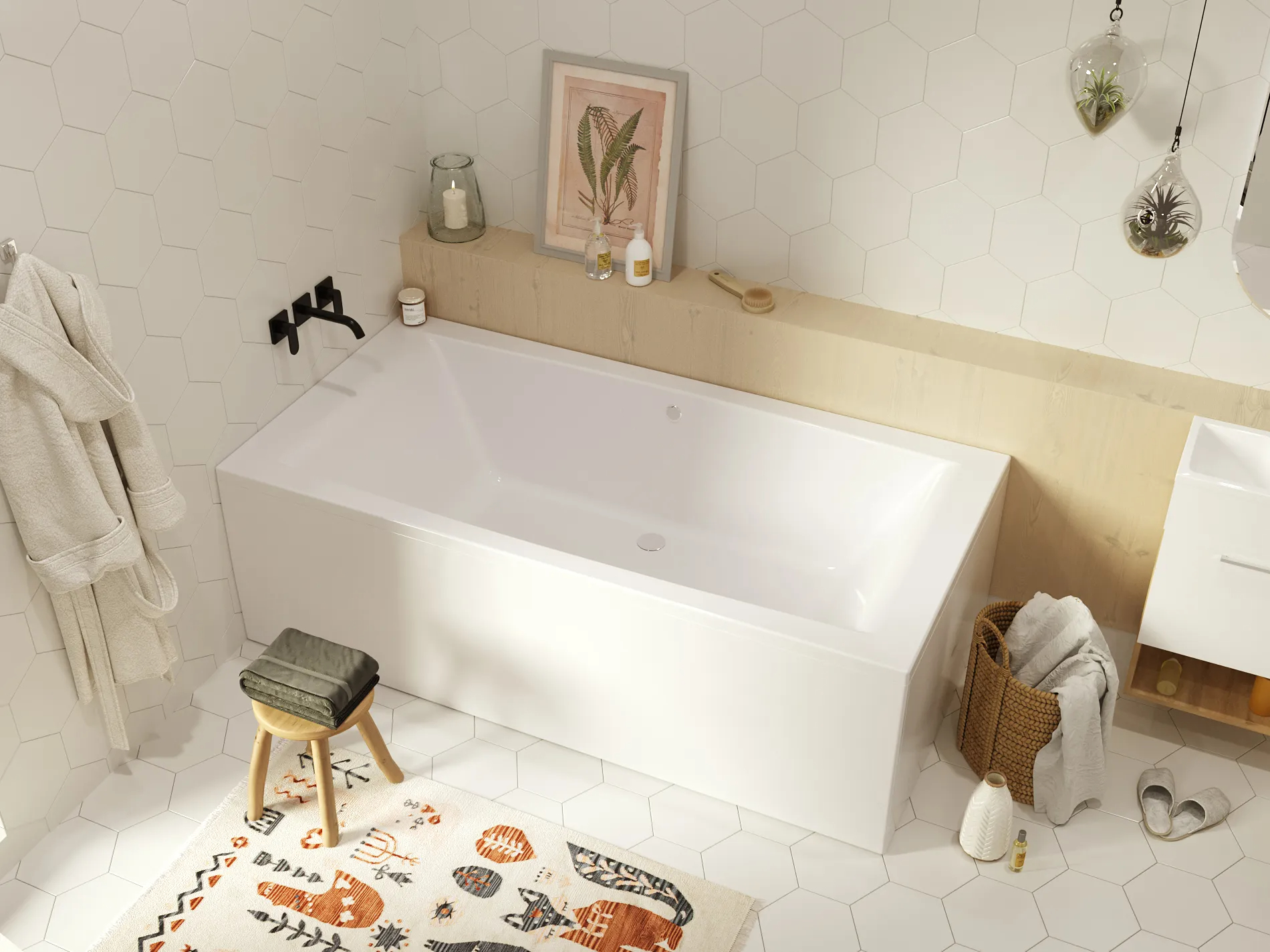• Низкая теплопроводность акрила сохраняет тепло набранной воды на протяжении нескольких часов. Материал безопасен. Не выделяет вредных веществ, не обладает запахом. Не скользит.