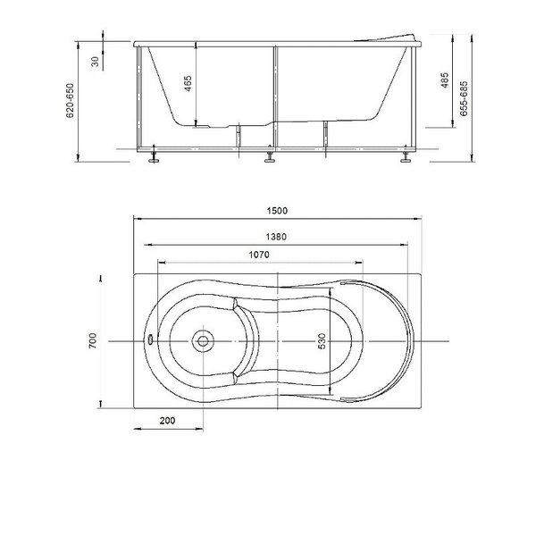 Ванна акриловая Акватек Афродита 150х70 на каркасе, с фронтальным экраном, слив-перелив