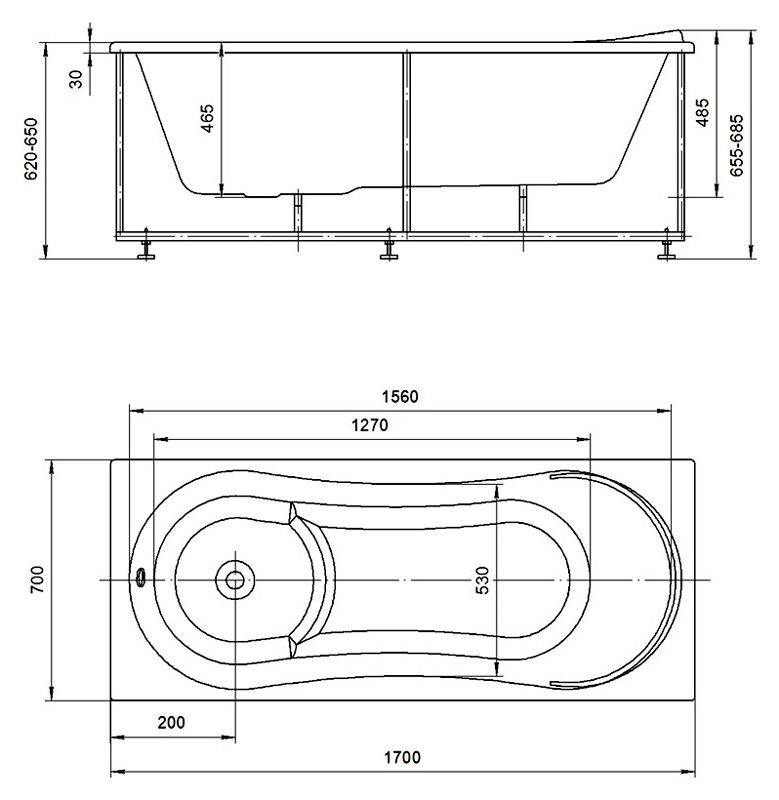 Ванна акриловая Акватек Афродита 170х70 на каркасе, с фронтальным экраном, слив-перелив