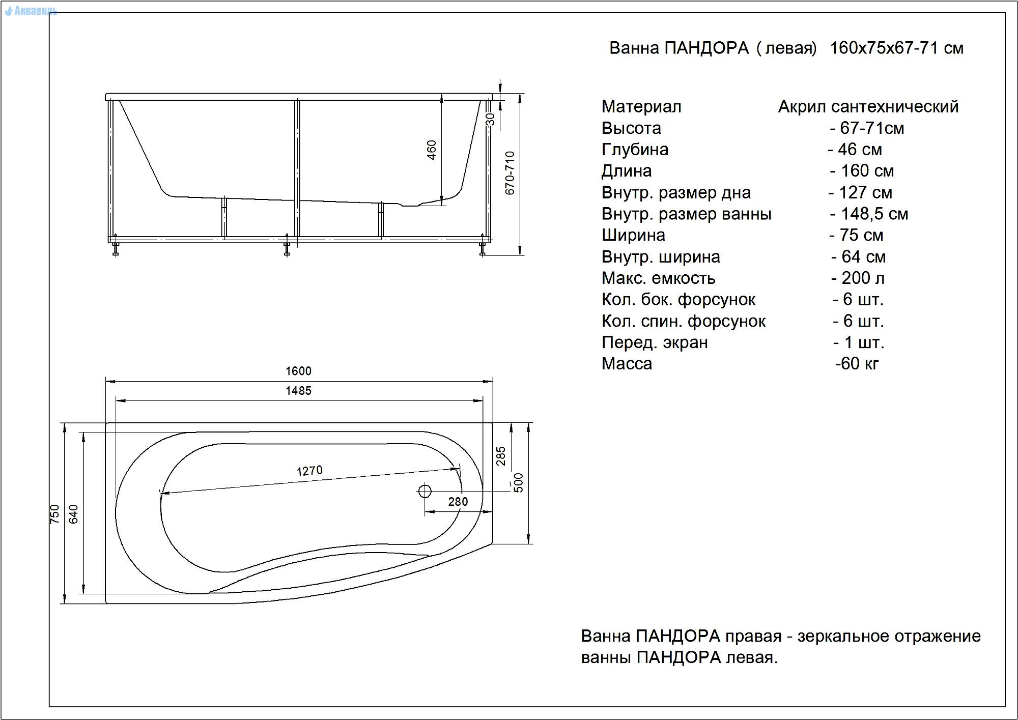 - 1. Ванна акриловая Акватек Пандора 160х75 L без гидромассажа